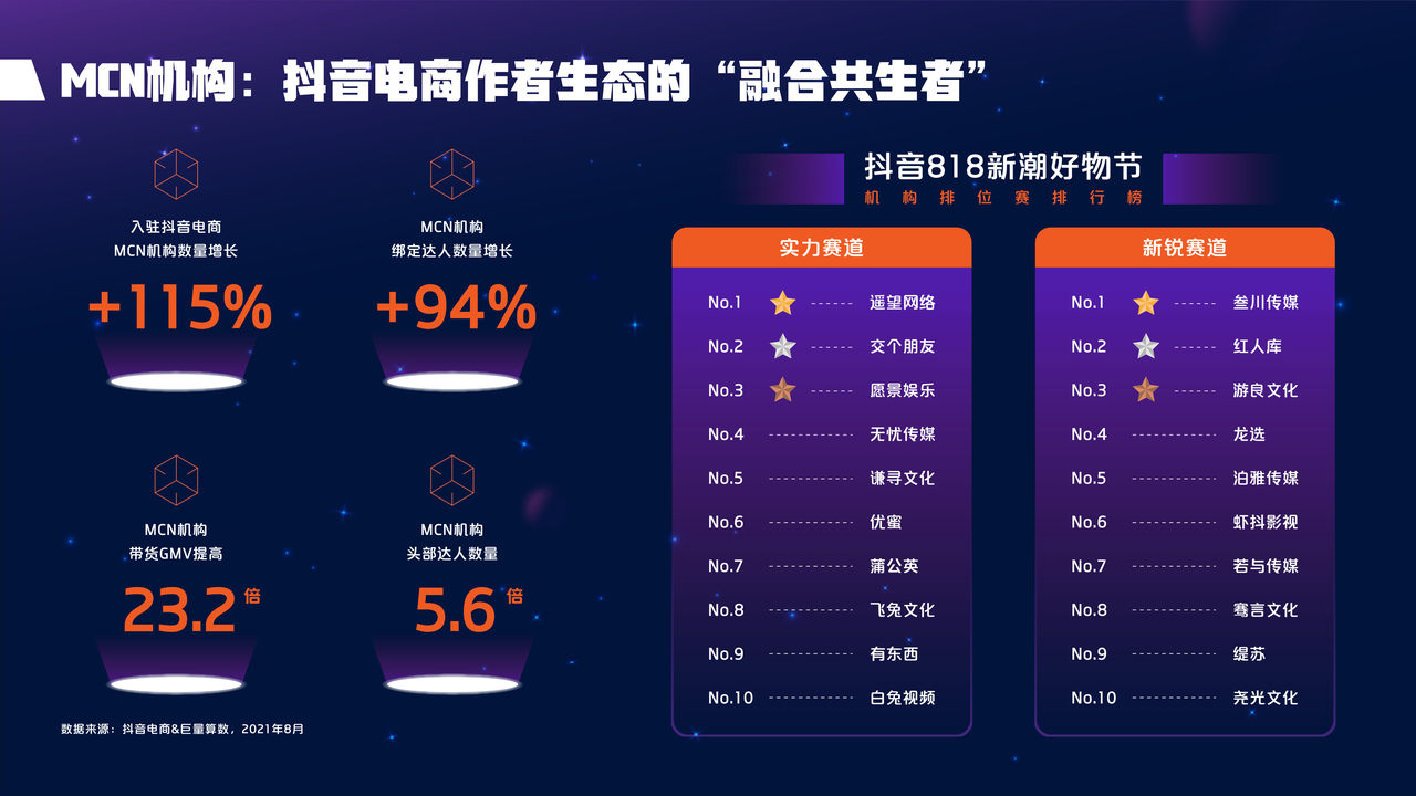 报告显示,2021年8月,入驻抖音电商的MCN机构数量增长115%,MCN机构绑定达人数量增长94%,MCN机构带货GMV提高了23.2倍,头部达人数量提高了5.6倍,抖音电商达人生态愈加繁荣。