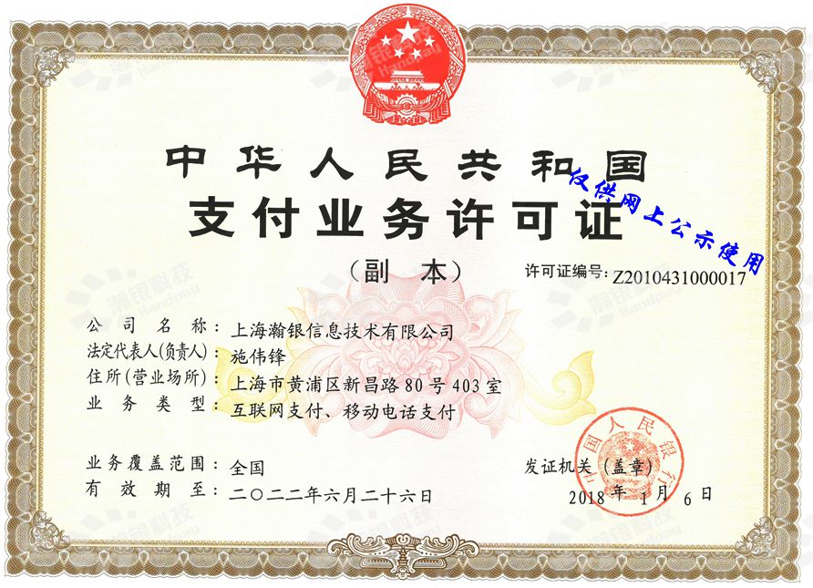 上海瀚银的支付牌照范围为互联网支付和移动电话支付,公司法定代表人是施伟锋。